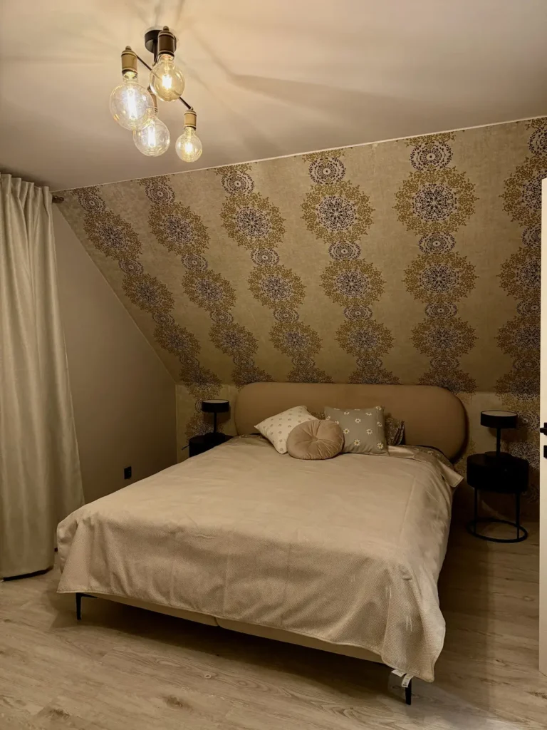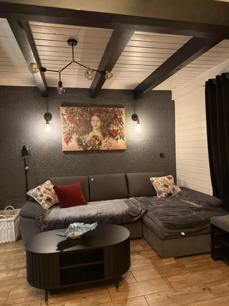 Klimatyczny domek stworzony dla komfortowego wypoczynku 8–10 osób. Wnętrze obejmuje dwie eleganckie sypialnie, każda z podwójnym łóżkiem oraz rozkładaną kanapą, przestronny salon z kominkiem i dodatkową sofą, nowoczesną kuchnię z pełnym wyposażeniem, łazienkę oraz osobną toaletę.