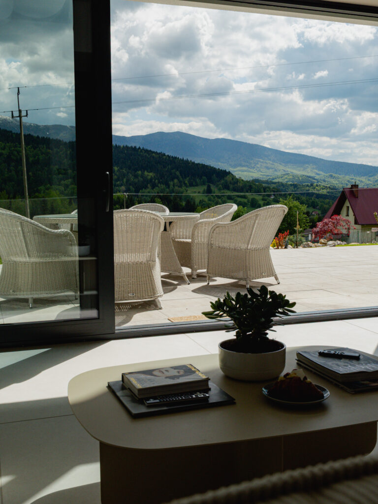 Z samego salonu wychodzisz na duży taras z pięknym widokiem na góry, łąki i lasy. Czasem tuż obok przechodzi stado owiec – to codzienny widok, który sprawia, że czujesz się jak na prawdziwej, górskiej wsi. Spokój, cisza, zieleń – wszystko, czego potrzeba, żeby się zresetować.